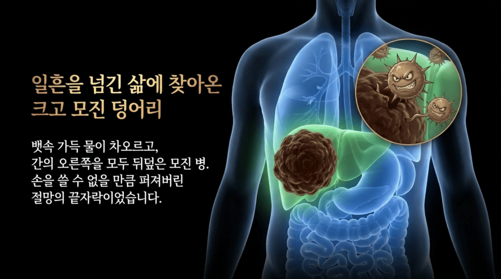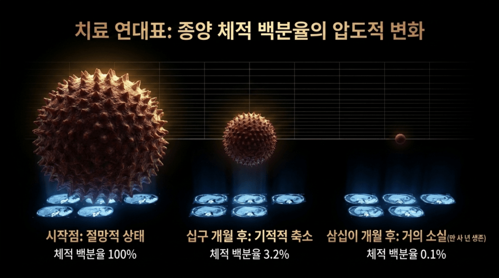 사진에서 보듯이 간은 위축이 되었지만 커다란 종양은 거의 없어져서 일부분만 남아 있다. 당시 의무기록을 보면,