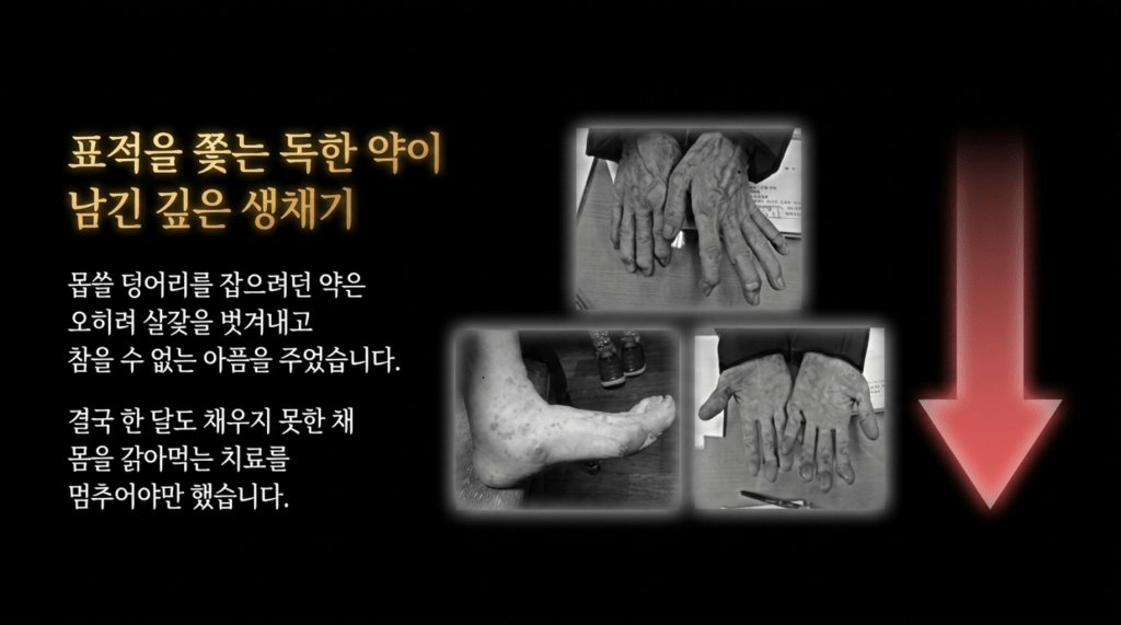 무조건 한약은 독이 있고 간에도 나쁘다는 말을 쉽게들 하는데, 이 사례는 오히려 양약이 독이 있어서 허물이 벗겨지고 종양이 급속도로 더 자랐음에도 이런 이야기는 하지 않는다.