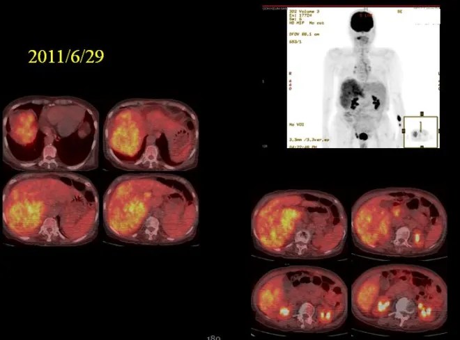 이 환자는 2014년 2월에 암이 거의 없어진상태에서 이전종양은 초기에 비해 0.1 % 정도로 감소하였으나. 새로이 다른부위에 3.5cm 종양이 보였는데, 이후에 치료를 받지 않았다.