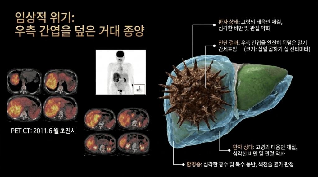 PET에서 보이듯이 우측 간엽은 모두가 암이었다. 그래서 보호자들에게 내 생각을 이야기하였다.”나이가 젊으면 한 번 시도해 보겠고 연장이 되시겠지만 현재 흉복수가 모두 차서 알부민도 맞아야 하고 병원에서 심하면 복수를 빼가면서 영양제 공급과 함께 병원을 들락날락 해야 되니 요새같이 바쁜 세상에 가족들도 힘들고, 노인도 오히려 빨리 돌아가시는 게 도와주는 길이라고 이야기 하였다.