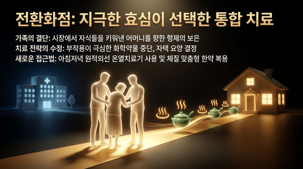 한데 이가족 형제들은 우애가 놀랍고 두 분 다 대단한 효자였다. 어머니가 우리를 시장에서 장사하시면서 대학을 보냈다고 ,고생해서 키우느라고 얼마나 애쓰셨는데 우리 가족은 어머니에 대한 보답을 해야 한다면서 아무리 힘들고 경제적으로 어려워도 최선을 다 해 보겠노라고 하였다. 환자는 체중도 많이 나가고 무릅도 약하고 비만이었고 일반인처럼 운동이나 여러 가지 다른 요법을 하지 못할 것 같아 보였다.
