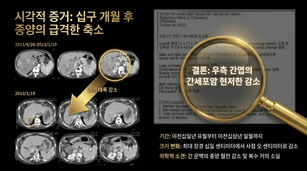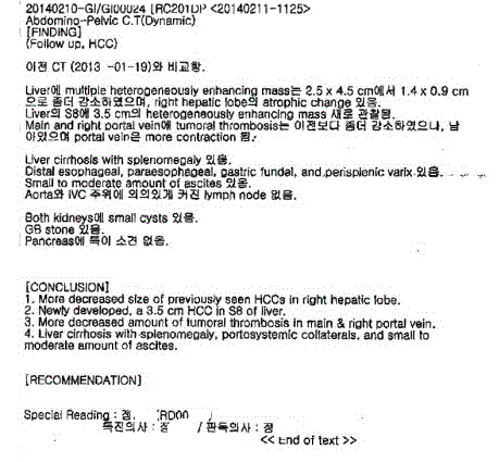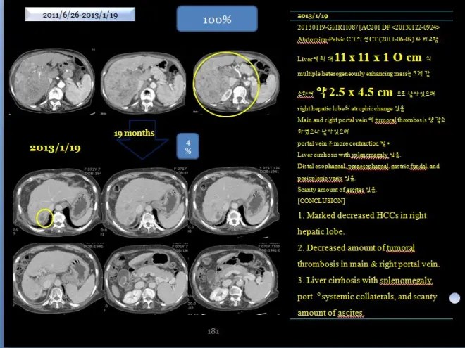 “2011년 년 6월 9일과 2013년 1월 19일 CT 를 비교함. 간에 있던 최대 장경 11x11x10cm의 균일하지 않케 조영되는 암은 크게 감소하여서 2.5x 4.5로 줄어들었다. 우측간은 위축되어 있고, main과 우측의 portal vein의 종양에 의한 thrombosis 양이 줄어들었으나 남아 있고, portal vein (문맥)은 더욱 수축되어 있다. 간경화와 비장종대도 있다. 식도와 위장 부근의 비장 옆의 정맥류가 보이며 약간의 복수가 있다.”