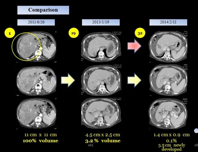 18 개월만에 간의 종양이 거의 체적대비하여서 4% 정도로 줄어들었고 2014 년도 3월에 통합의학대회에서 본인이 강의하기 전에 환자에게 CT 를 찍어볼 것을 권유하였다.