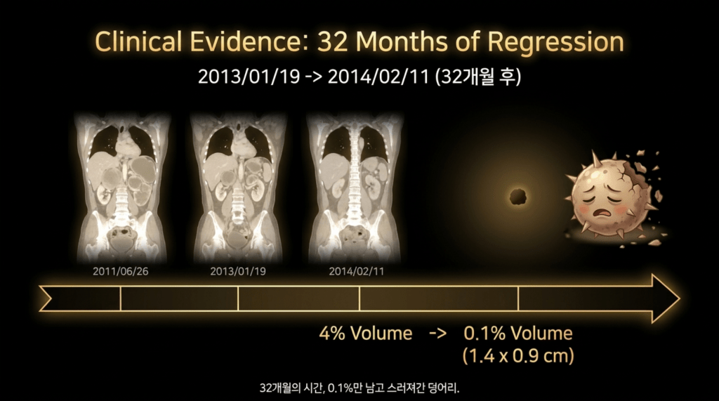 이분은 광주분이라 거의 내원을 하지 않고 전화상담과 약물만 꾸준히 지어서 복용하였는데 만 3년이 넘은 2014년 봄에는 더욱더 종양이 줄어들었지만 부분적으로 재발소견을 보였다.