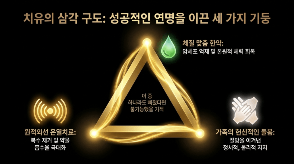 하지만 이분이 말기중에 말기에 와서 3년 세월을 종양이 줄어서 정상 생활을 할수 있었던 요인을 생각 해보면 세가지로 생각이된다..