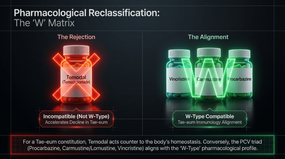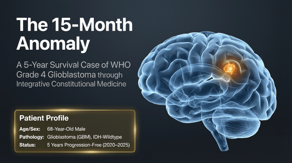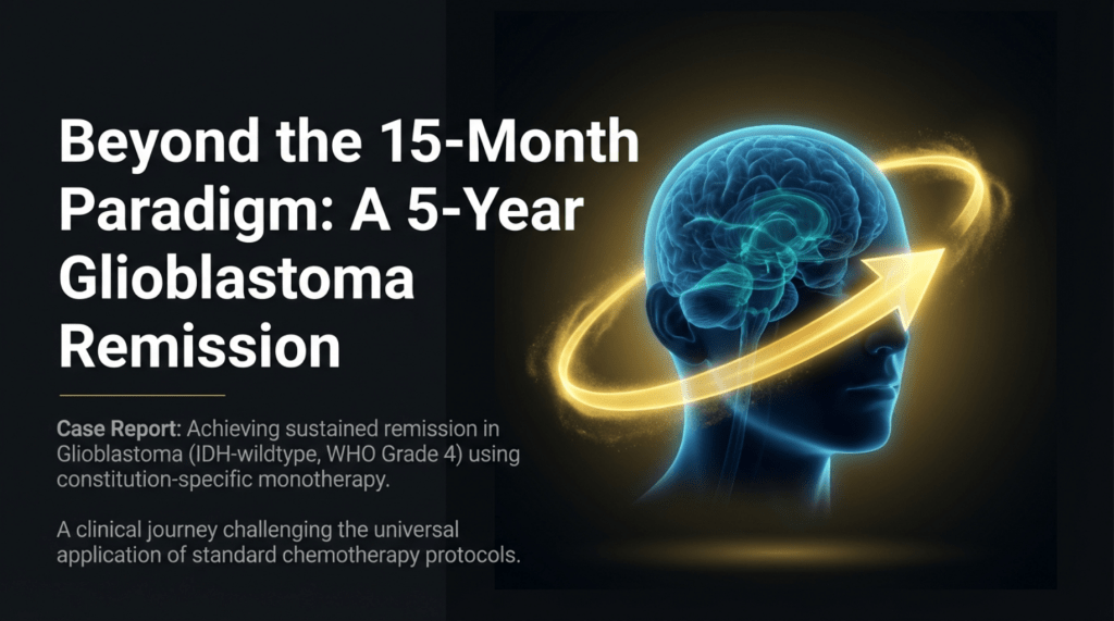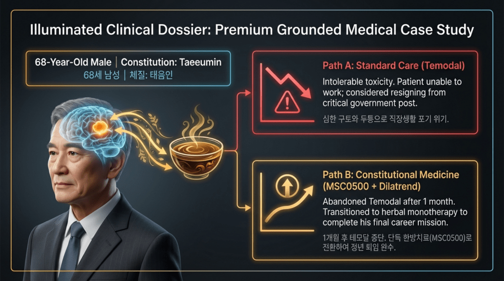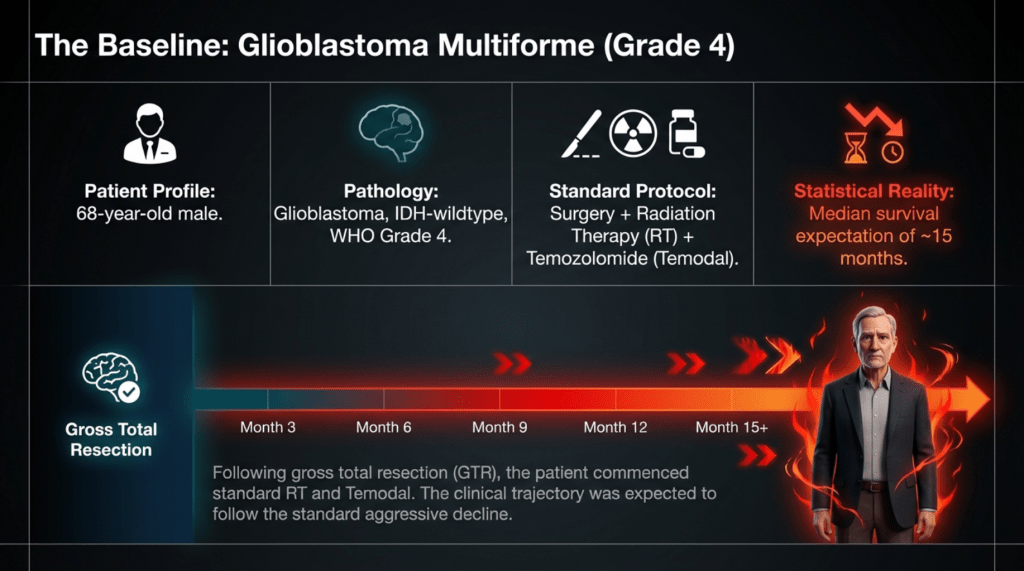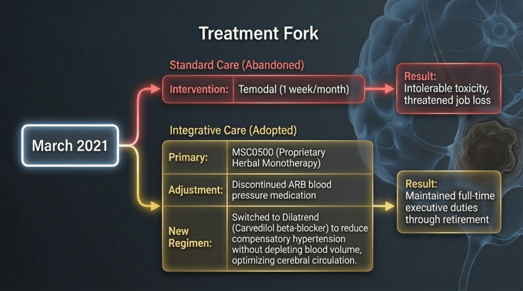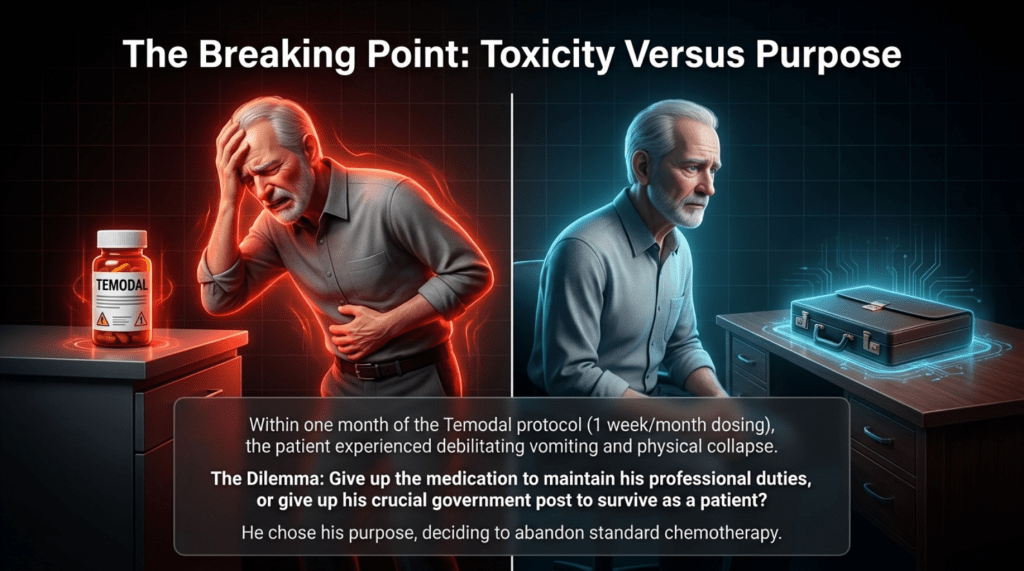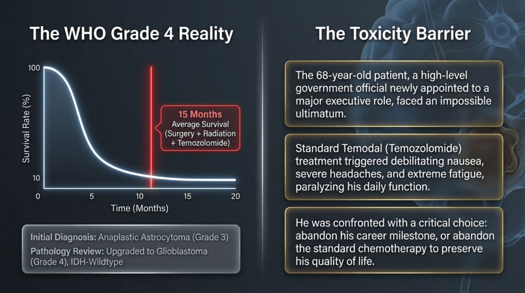 During the course of standard treatment—including surgery, radiotherapy, and one month of temozolomide—the patient experienced severe headaches and profound side effects that led to extreme physical debilitation. As a result, he discontinued treatment and, upon the recommendation of friends, came to seek my care.