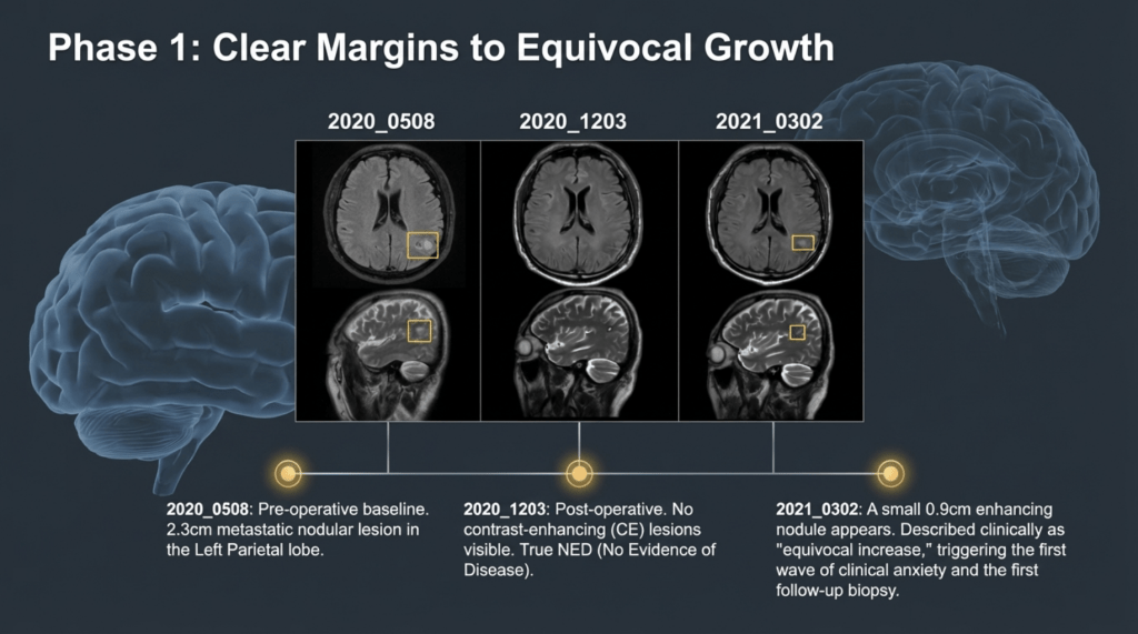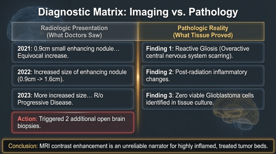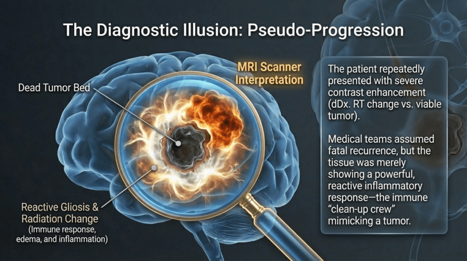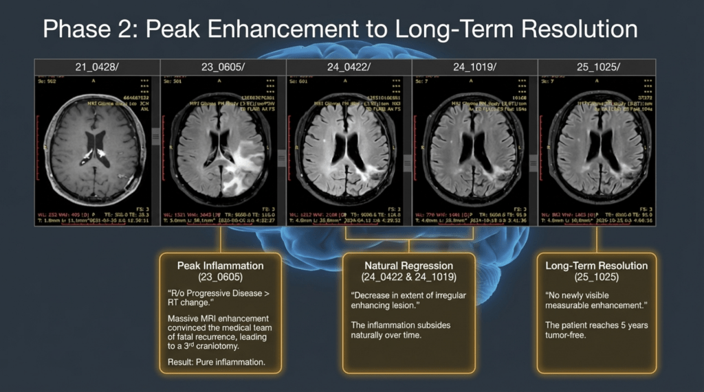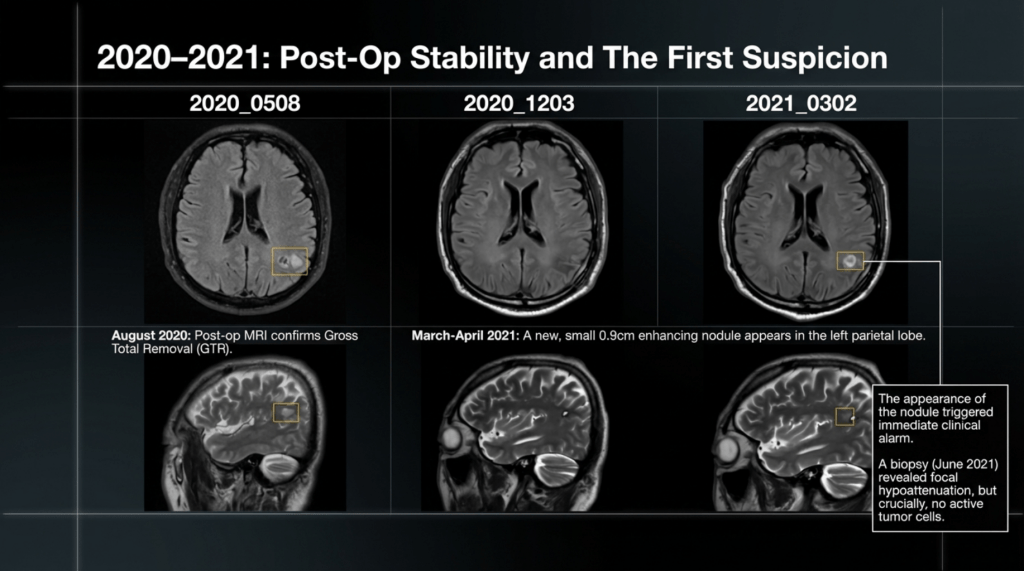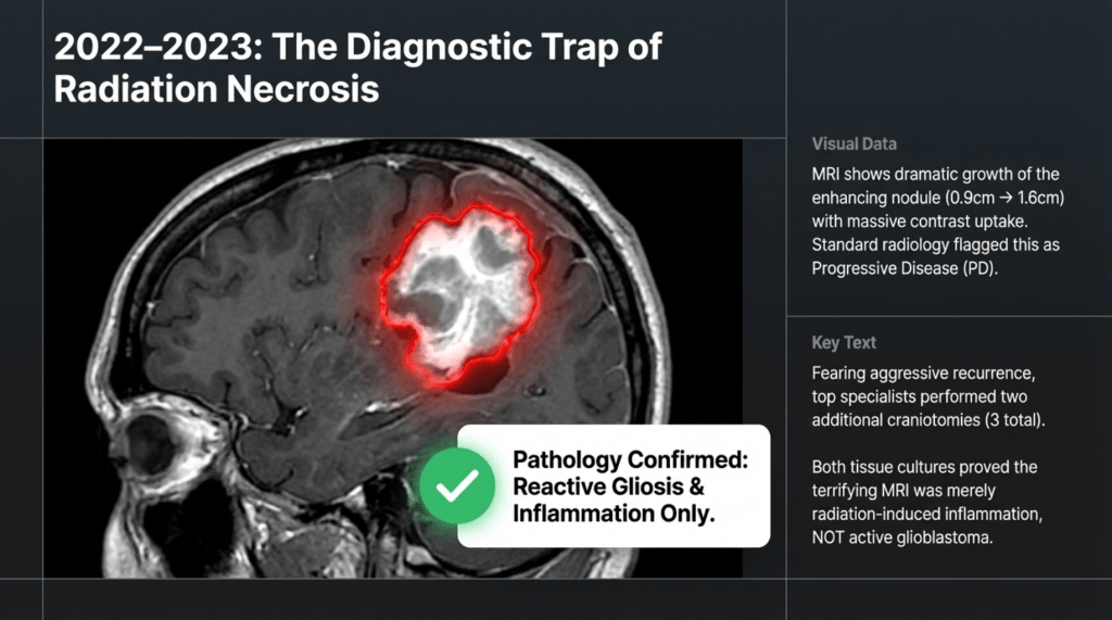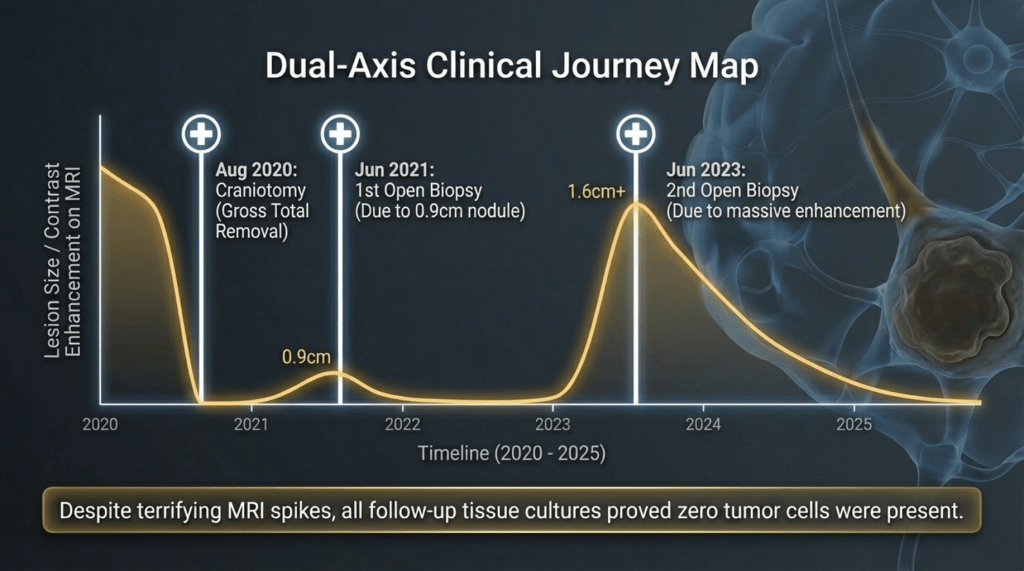 When MRI scans showed increased contrast enhancement at the surgical site, it was strongly suspected to represent recurrence. Consequently, repeat craniotomy and tissue biopsy were performed. Yet again, both instances were ultimately identified as post-radiation effects and inflammatory responses, rather than viable tumor tissue.