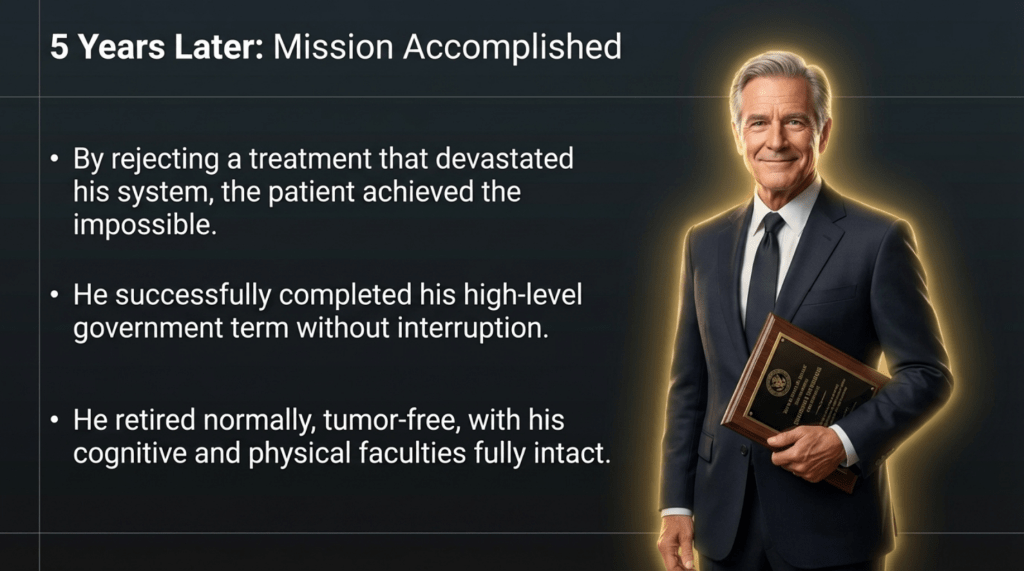 Subsequently, he successfully survived beyond five years, continued to perform his duties without interruption, and ultimately completed his term and retired honorably at the standard retirement age.
