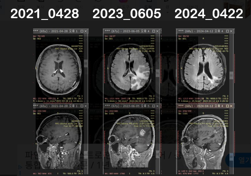Initially, the patient was diagnosed at Chungnam National University Hospital with anaplastic astrocytoma (AA, WHO Grade 3). However, after being transferred to Seoul National University Hospital, an external slide review was conducted and the histopathology was reassessed.