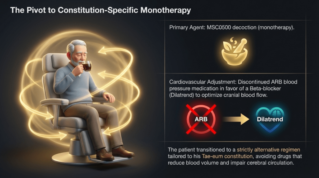 At my recommendation, among his conventional medications, his antihypertensive therapy was adjusted. He had initially been taking an ARB (angiotensin receptor blocker), but considering his constitutional type, I determined that it was not appropriate. Therefore, it was changed to a beta-blocker (Dilatrend, carvedilol), which I considered more suitable.