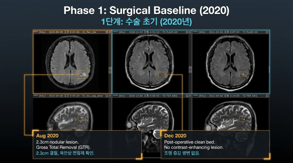 The attending physician in charge of this patient consistently maintained, at every three-month follow-up visit at Seoul National University Hospital, that “the tumor cannot simply stop growing; it is just not visible at the moment.” Based on this concern, the patient underwent two additional craniotomies for tissue sampling. However, in both cases, the pathology revealed only inflammatory changes, with no evidence of tumor recurrence.