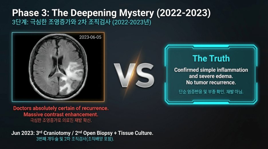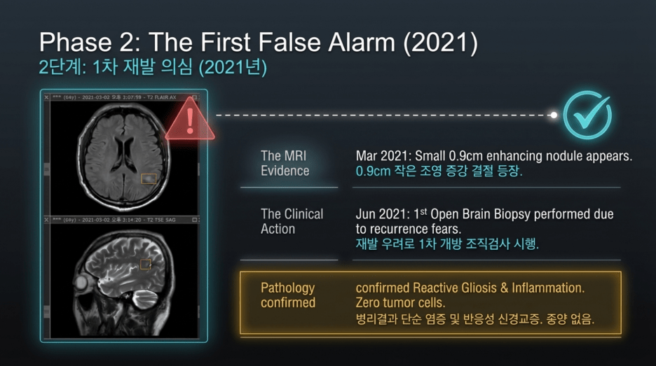 Following the first biopsy in June 2021, a second biopsy was performed in June 2023, two years later, due to radiologic concern on MRI. However, despite the markedly increased contrast enhancement seen on imaging, the lesion was ultimately confirmed to represent inflammation and edema, not tumor recurrence.