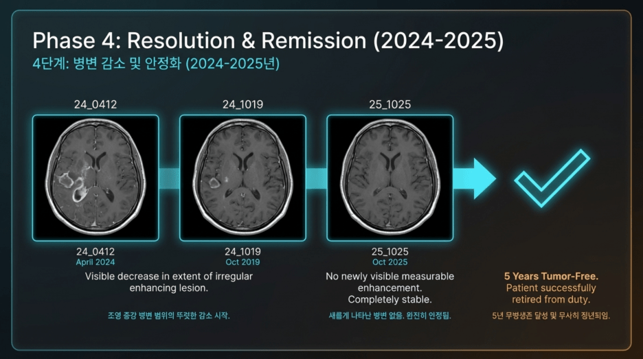 Even as a senior professor at Seoul National University Hospital, the physician appeared perplexed and concerned during follow-up visits, expecting recurrence that never materialized. After the physician’s retirement, care was transferred to another doctor, and the patient continued follow-up for an additional two years. The imaging interval was gradually extended from every three months to every six months, and now, more than five years later, the patient remains recurrence-free.