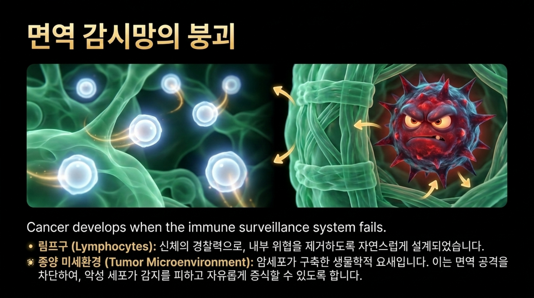 암은 림프구가 약해지면서 면역감시망이 붕괴되는것이다. 이것을 우리는 보완하기위해서 세포독성 항암제와 같은 외부림프구라고 비유할수 있는 군대의 지원을 받는것이다.