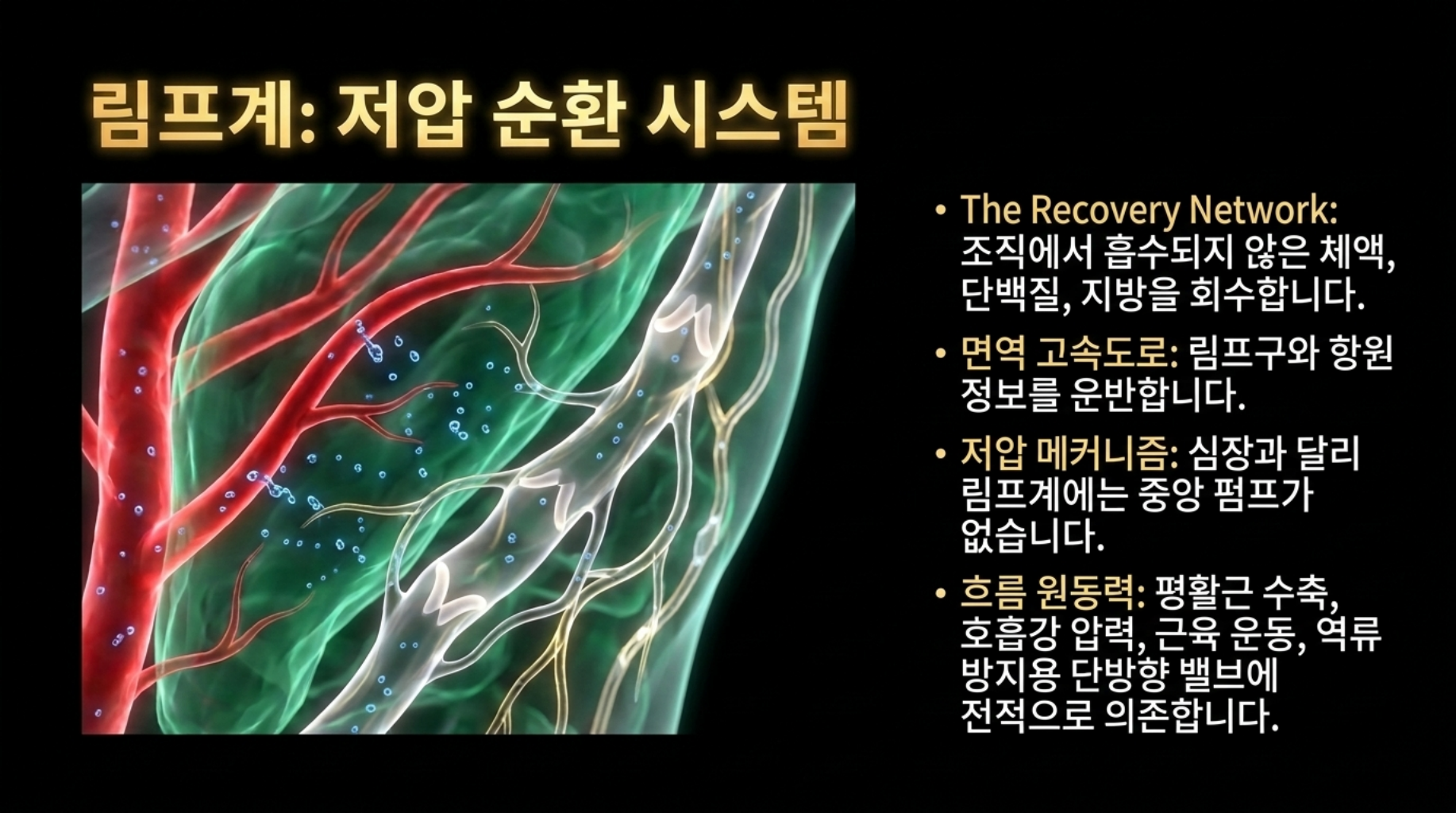림프계는 단순한 배액 시스템이 아니라, 단백질과 지방을 운반하고 면역세포를 이동시키는 중요한 기능을 동시에 수행한다. 특히 장에서 흡수된 지방은 림프를 통해 운반되며, 항원 정보 역시 림프를 따라 이동하여 면역 반응을 유도한다.