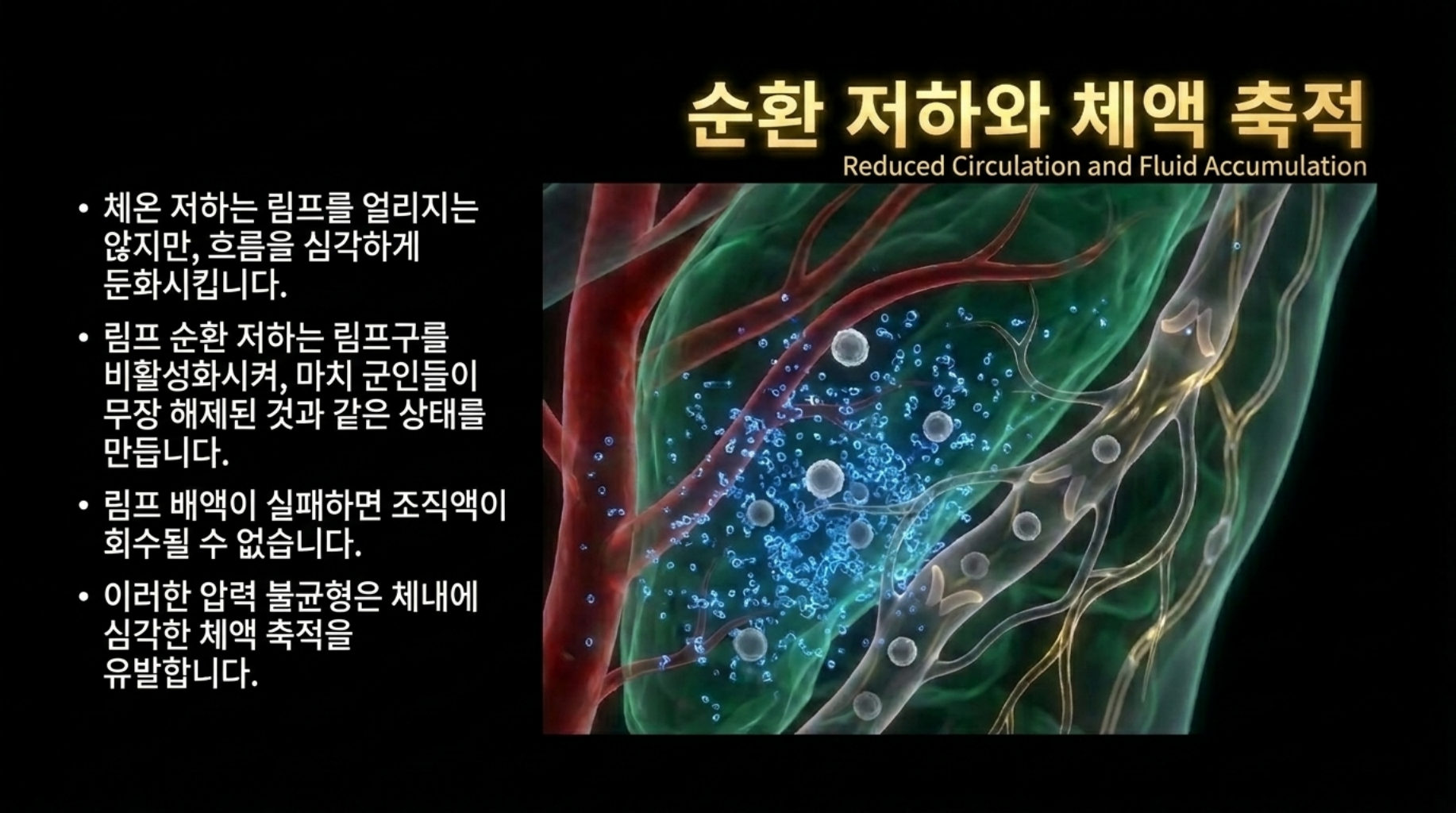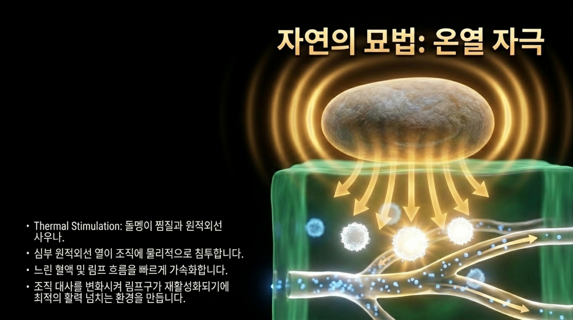 온열 자극은 림프 순환과 혈류를 촉진하여조직 내 대사와 면역 환경을 개선하는 데 도움을 줄 수 있다.림프액은 수분과 단백질, 그리고 일부 지질 성분으로 구성되어 있으며,엄밀히 말하면 체온이 떨어지면 굳는 것이 아니라 전반적인 순환 기능이 저하되어 흐름이 둔화될 수 있다.이러한 상태는 마치 군인과 경찰에 해당하는 림프구의 활동이 위축된 것과 유사하게 볼 수 있다.