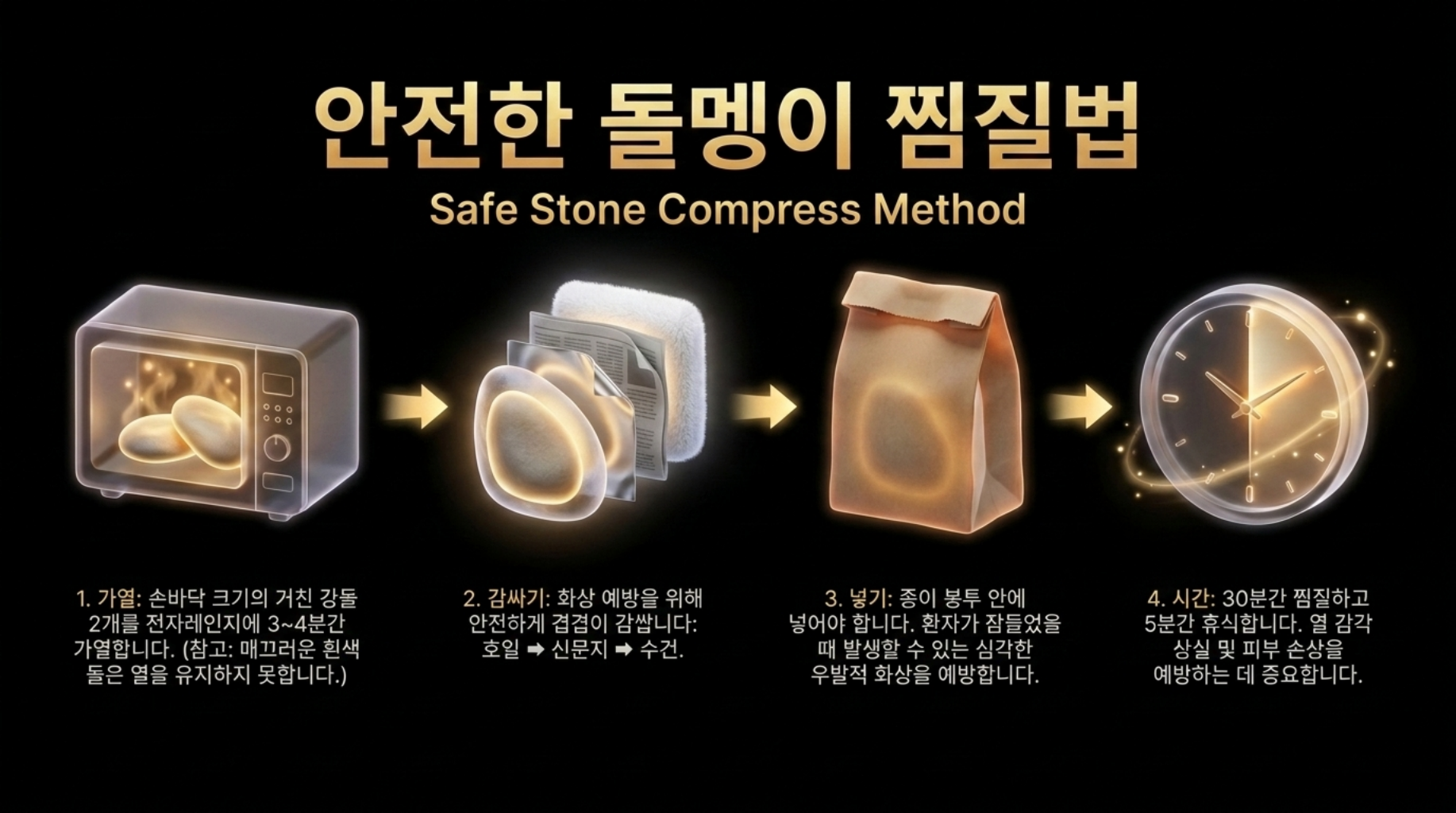돌멩이 찜질은 먼저 돌멩이 투명한 흰색돌멩이는 열을 함유하지 않는다. 그래서 약간 거친표면의 일반 강가에서 흔히 볼수있는 자갈을 두손바닥 합친정도로 크기와 두께의 돌멩이를 구해서 이를 전자렌지에 3-4분을 넣어둔다.